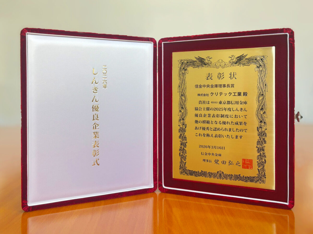 2026年3月16日、株式会社クリテック工業は「2026年しんきん優良企業表彰」において、信金中央金庫理事長賞を受賞いたしました。