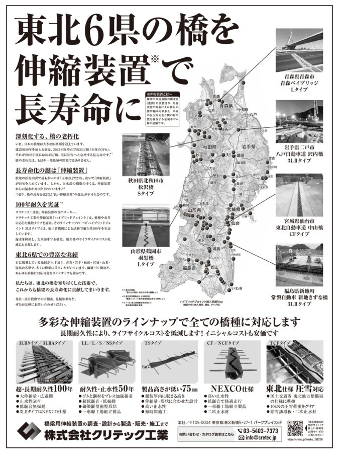 本広告では、東北6県における当社伸縮装置「ハイブリッドジョイント」の納入実績を地図と事例写真で紹介するとともに、社会課題となっている橋梁の老朽化と、その長寿命化における伸縮装置の重要性について訴求しています。
